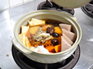 鍋に具材を敷き、上記2で取っただしを濾して注ぎ入れ、火にかける。