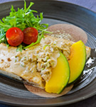 焼き上がったら皿に乗せ、カボチャ、水菜、トマトを飾って、アボカドソースをかける。